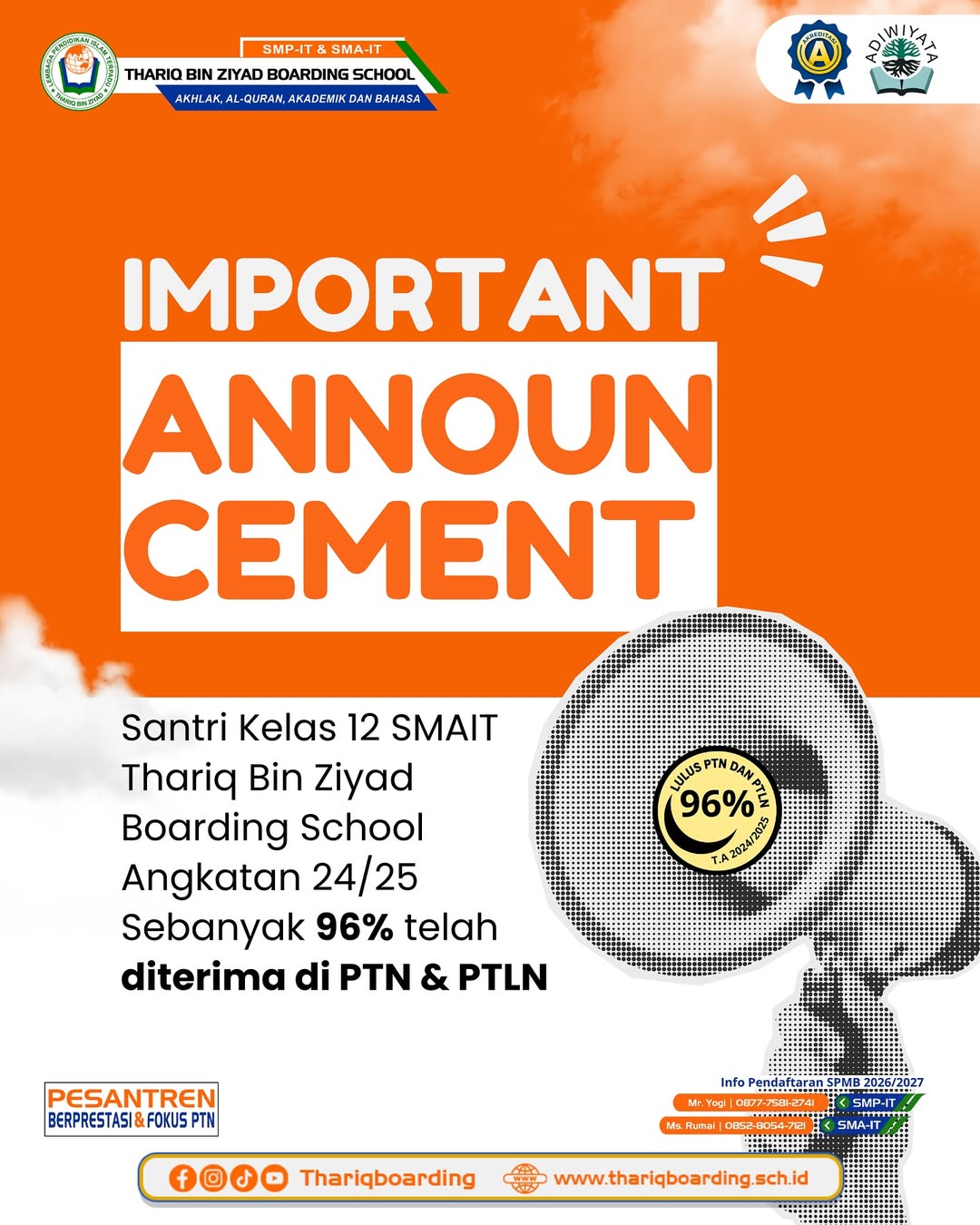 Dengan pembinaan akademik yang terstruktur, program bimbingan karir, serta pembiasaan disiplin ala pesantren, para siswa ditempa tidak hanya untuk unggul secara akademik, tetapi juga memiliki integritas dan karakter Islami. Prestasi ini menjadi inspirasi bagi angkatan berikutnya untuk terus berusaha dan berprestasi, membawa nama baik Thariq bin Ziyad Boarding School sebagai sekolah Islam modern yang berkualitas dan berorientasi pada masa depan.